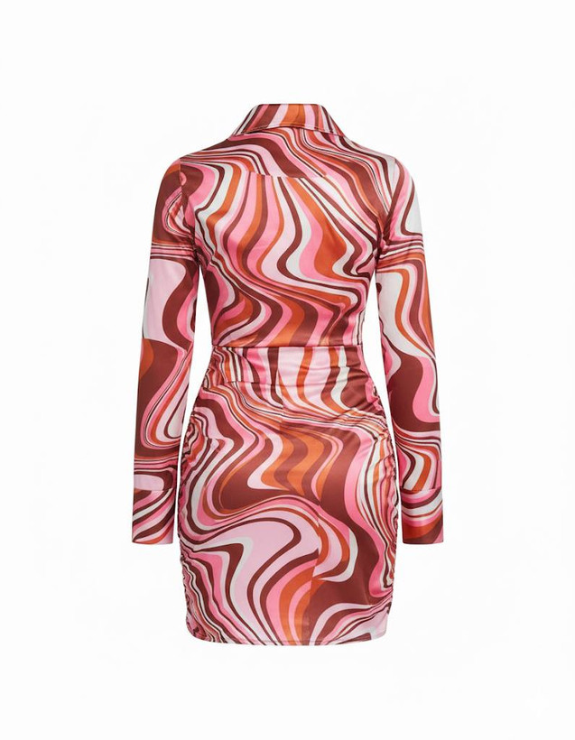 این پیراهن کوتاه آستین بلند با الهام از دهه ۷۰ میلادی، یک انتخاب جسورانه و شیک است. طرح مارپیچ و رنگهای چشمنواز شامل طیفهای صورتی، قهوهای سوخته، قرمز و سفید کرم، استایلی نوستالژیک اما کاملاً بهروز را برای شما به ارمغان میآورد.