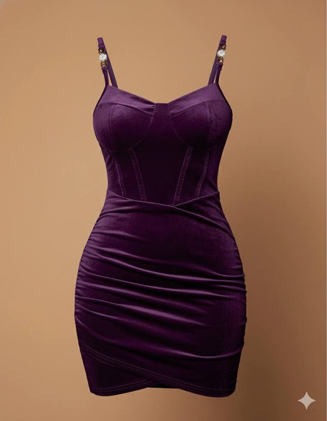 پیراهن کوتاه مخمل مجلسی، رنگ بنفش سلطنتی. جنس مخمل اعلا در کنار برش کرستی (Corset) در قسمت بالاتنه، جلوهای فاخر به این لباس داده است. جزئیات ظریف چیندار و اورلپ (Overlap) دامن، تنخور بسیار جذابی ایجاد میکند.