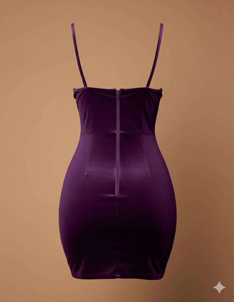 پیراهن کوتاه مخمل مجلسی، رنگ بنفش سلطنتی. جنس مخمل اعلا در کنار برش کرستی (Corset) در قسمت بالاتنه، جلوهای فاخر به این لباس داده است. جزئیات ظریف چیندار و اورلپ (Overlap) دامن، تنخور بسیار جذابی ایجاد میکند.